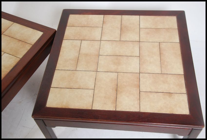 A pair of retro 20th century dark teak and tile top coffee - occasional tables Each raised on squared supports with chamfered leading edges, the tables having inset tiles atop to each