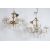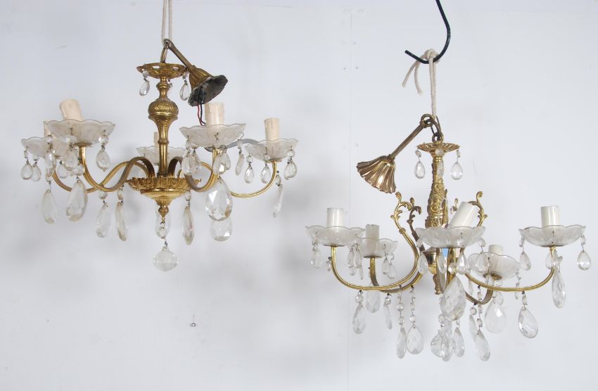 A pair of mid century vintage gilt metal rococo style 5 branch ceiling light chandeliers. Each with scrolled arms and bulbous centres