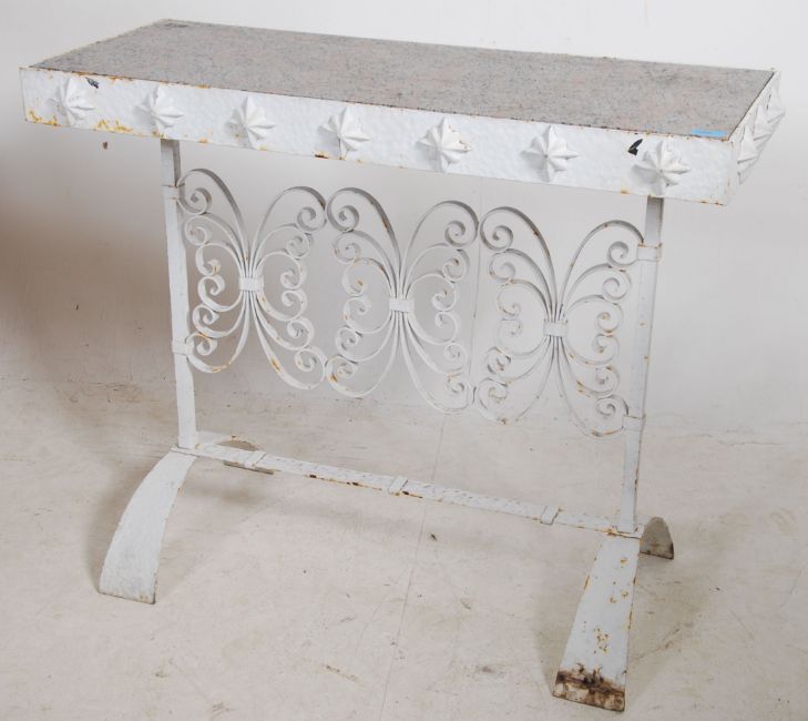 A 20th century Art Nouveau cast metal and granite inlaid table. The cast iron base painted white with splayed legs having inset granite table top above. Measures 81cm high x 100cm wide x 40cm deep.