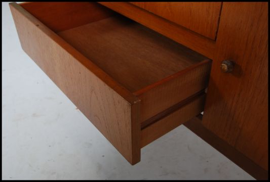 A vintage mid 20th century teak sideboard credenza, two cupboards over two drawers. The drinks cabinet opening with metamorphic action to reveal a fully appointed mirrored back shelved interior. Raised on tapered legs united by stretchers. Measures 110cm high x 130cm wide x 45cm deep.