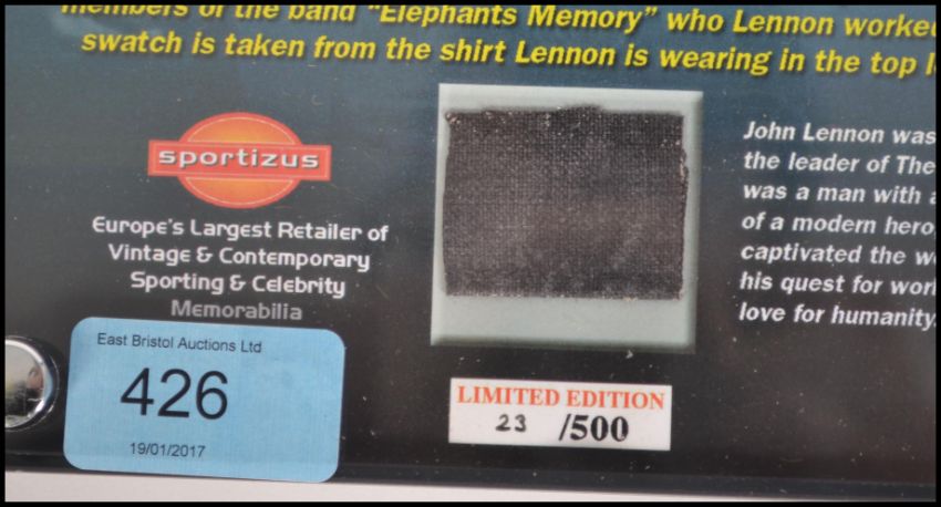 An original swatch of John Lennon's shirt - mounted in a sealed presentation display with integral certificate by Sportizus.