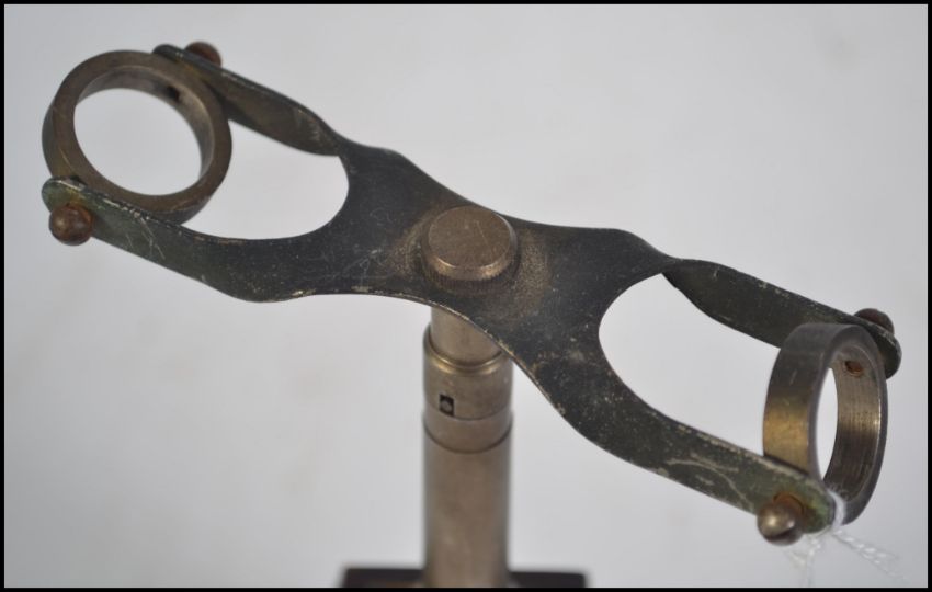 A 19th century German patented manual centrifuge test tube instrument with cast metal body in burgandy with gilt coachlining having crank handle verso.  Embossed stamp DRGM