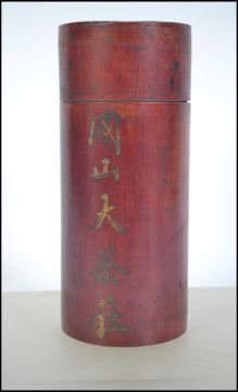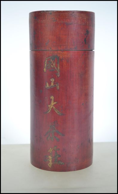 An early 20th century Chinese bamboo chinoserie painted brush pot with lid Decorated with plant pot scene being slightly worn. Measures 22cms high.