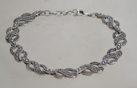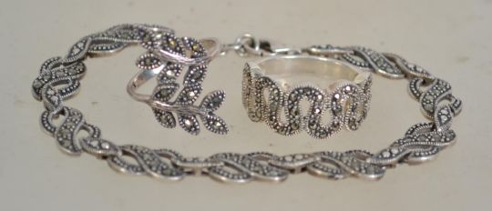 A group of silver and marcasite jewellery to include a marcasite bracelet with infinity link design and claw clasp, a silver ring with marcasite snake design and a marcasite leaf design ring. Bracelet measures 19cms. Total weight 21 grams.