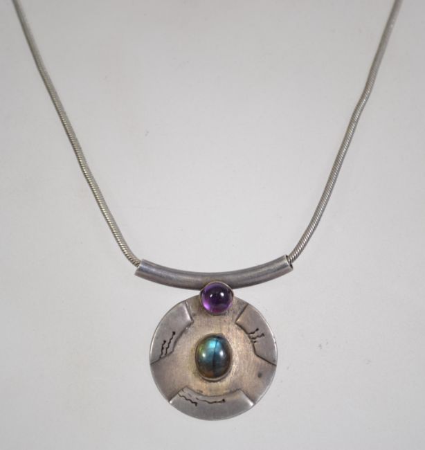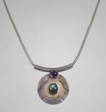 A silver 925 snake link necklace chain with lobster claw clasp having a amethyst and labradorite silver 925 shield pendant. Chain measures 14 inches and weighs 21.2 grams.