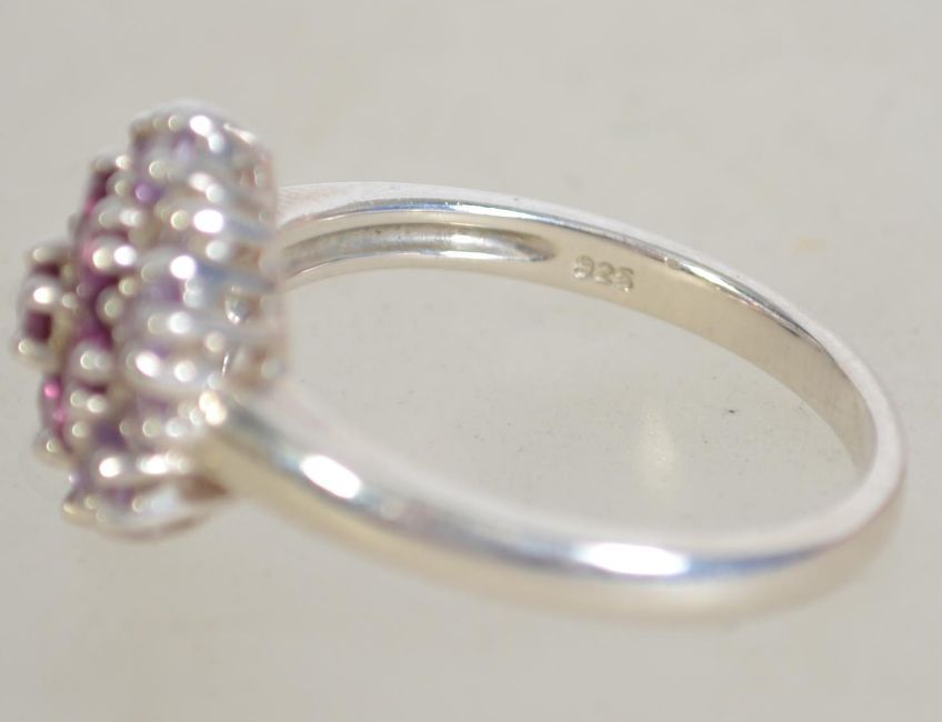 A silver 925 ladies dress ring with rhodolite stones arranged in a cluster setting with a halo of pale amethyst  stones. Weighs 4.6 grams size S.5.