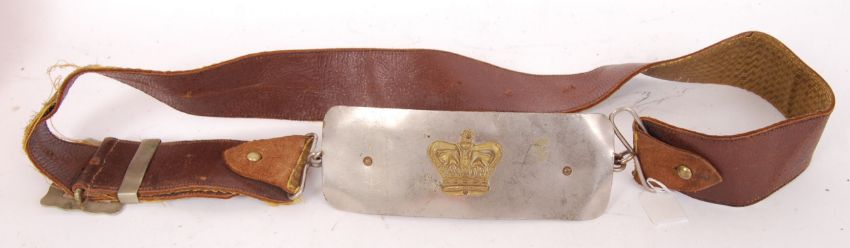 A believed Victorian military cross belt. With central steel block (wood backed) and crown badge to front. Leather belt. Measures approx 138cm long.