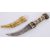An original Middle Eastern Islamic curved blade decorative dagger with mother of pearl inlaid handle & brass scabbard. Measures approx 23cm long.