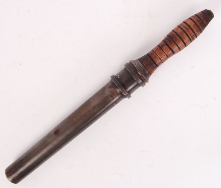 A rare WWII Second World War German made diver's knife. With turned wooden handle and screw top scabbard. Short length blade. Total length; 39cm.