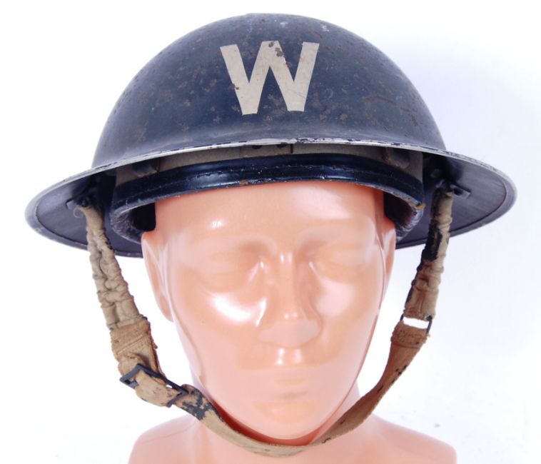 An original WWII Second World War 1940's Air Raid Wardens helmet with 'W' to front. '182 1940' stamped to inner rim. With liner and chin strap.