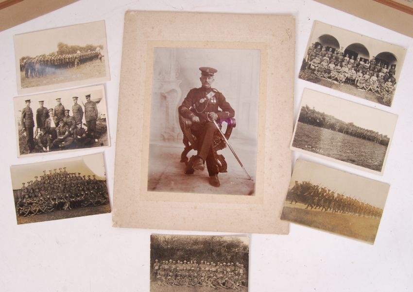 A collection of original WWI First World War regimental photographs - mostly appearing to be of local / South West interest. To include 3x larger size regimental photographs (all appearing to be the same regiment) the photograph being in Weston Super Mare, a larger size photograph of a soldier seated with his cavalry sword, and several real photo postcards mostly of 4th Wiltshire Regiment (A Company). Some others. Interesting collection.
