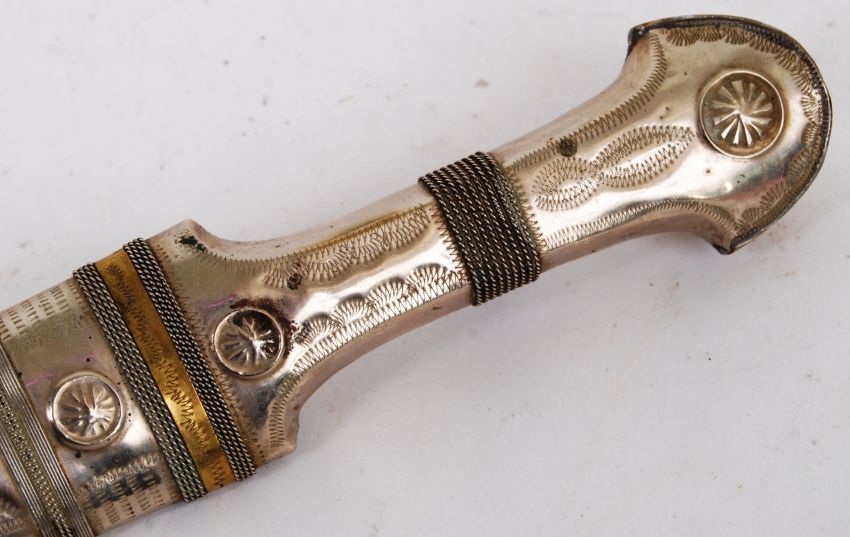 An early 20th century Syrian made Jambiya dagger / knife. With a likely silver white metal handle, with scabbard. 28cm long. Decorated with symbols to blade. POSTAGE: Worldwide postage / delivery available on all items. Combined postage available; UK £15.99+VAT, Ireland from £19.99+VAT, Europe from £19.99+VAT, USA / Canada from £30+VAT. Any other destinations please get in touch for a quote; info@eastbristol.co.uk. All quotes dependant upon location. Prices are per parcel (not per item).