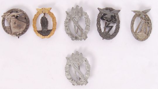 A collection of 6x replica / reproduction WWII Second World War German military badges. To include Kriegsmarine, Assault and Luftwaffe.
