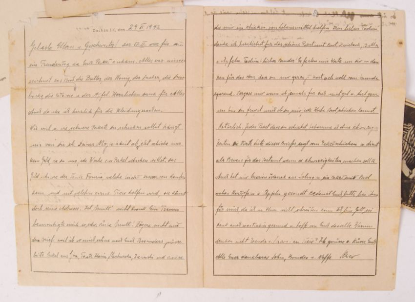 A collection of original WWII Nazi / Third Reich concentration camp ephemera. Comprising of a letter from an inmate at Dachau concentration camp, along with an original photo taken during liberation (liberating forces photographed inmates and scenes at Dachau to show the outside world the horrors within) showing two inmates working in the crematorium (VIEWER DISCRETION ADVISED), along with various other official German paperwork (believed unrelated), many with official stamps and markings.