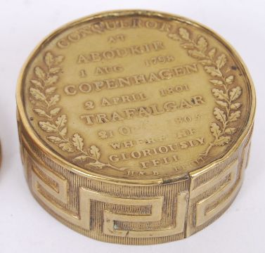 A good 19th century brass trinket box commemorating the battles of Admiral Lord Nelson. The lid heavily impressed with a bust of Nelson, his title and the dates in which he lived. To the base of the pot is impressed his three battle victories surrounded by laurel leaves. The side decorated with greek key style design. 5.5cm diameter.