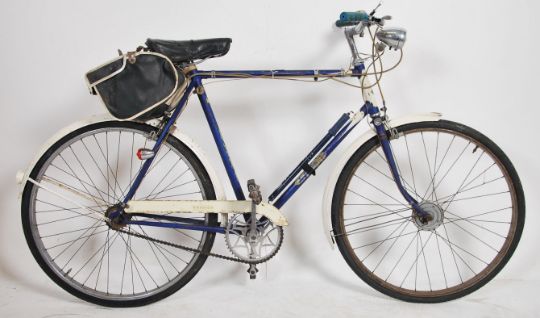 An original vintage Raleigh Trent Tourist bicycle / bike. In a great white and blue colour scheme. Fitted with front and rear lights and a period leather saddle. Decorative pedal plate.