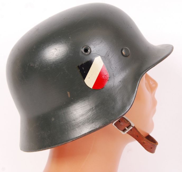 An original WWII Second World War German Army Third Reich M42 pattern uniform helmet. With an original liner. Impressed marks ET64 to rim and '57' to the leather liner. Believed restored / repainted.