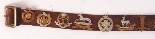 A collection of original WWI First World War regimental cap badges, mounted on a WWI leather uniform belt. Including badges for: Tank Corp, Fishguard, Royal Warwickshires, Middlesex Regiment and others. x15 total. Measures approx 86cm long.
