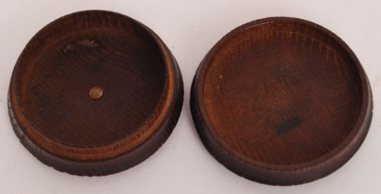 A rare antique turned oak trinket box made from the oak of HMS Victory, Nelson's Flagship. Topped with yellow metal (9ct gold) engraved to the lid with 'St Vincent, Nile, Copenhagen, Trafalgar,' surrounded by latin motto. To the base is engraved 'The Motto Of Lord Nelson Vincent Merton Baron Nelson Of The Nile. This Box Is Made From The Oak Taken From Nelson's Flagship The Victory.' 3" diameter.