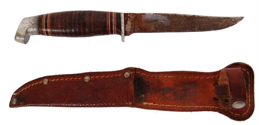 A 20th century striped wooden handled hunting / military knife. Possibly by Ragnar of Finland. Marks obscured. Knife housed in a tooled leather case with patterns of woodland animals. Approx 21cm long.  POSTAGE: Worldwide postage / delivery available on all items. Combined postage available; UK £15.99+VAT, Ireland from £19.99+VAT, Europe from £19.99+VAT, USA / Canada from £30+VAT. Any other destinations please get in touch for a quote; info@eastbristol.co.uk. All quotes dependant upon location. Prices are per parcel (not per item).