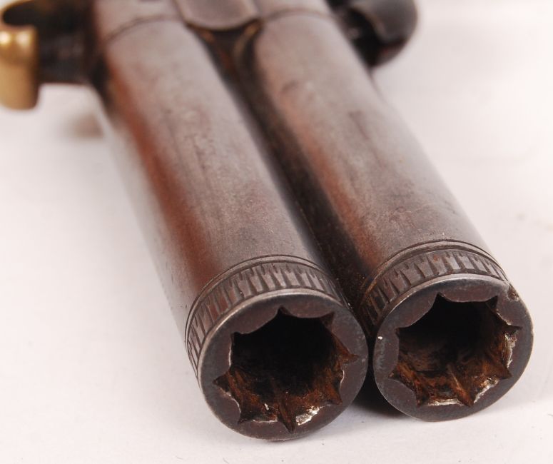 An early 19th century two barrelled turn-over percussion muff box lock pistol. With concealed trigger, bronze body highly foliate engraved. Marked to 'E Gill, Liverpool,' 19th century. With silver escutcheon and butt cap, and slide safety. Approx 1cm bore. Both barrels bear British proof hallmarks.