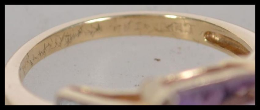 A 14ct yellow gold amethyst and diamond ladies ring. The square cut amethyst flanked by round cut diamonds having baguette stones to the shoulders. Weight 6g / Size O