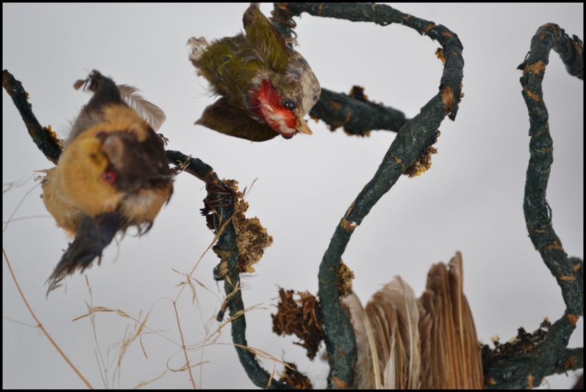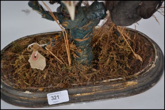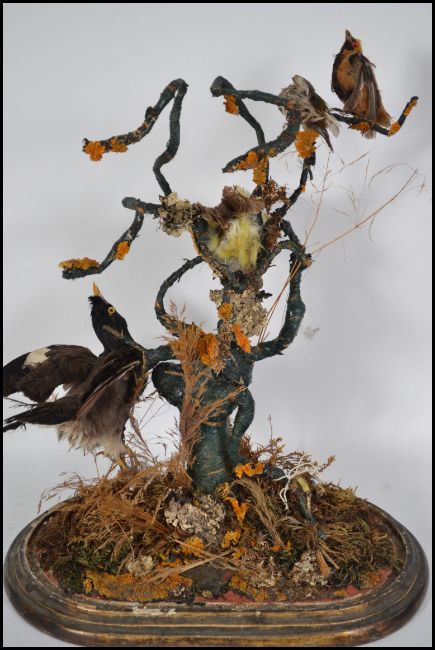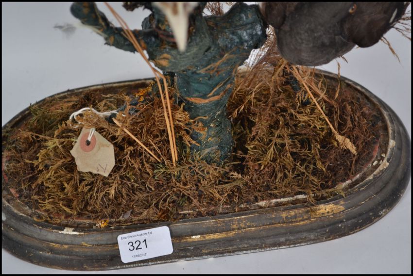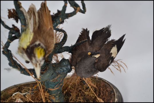A late 19th century taxidermy display of  birds, naturally set on branches with an oval wooden ebonised base. Measures 50cm high.