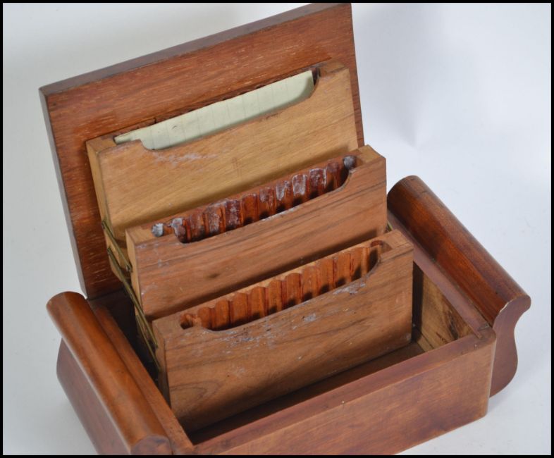 An early 20th century inlaid cigarette case of table top form with marquetry decoration and metamorphic cigarette holder set within. Complete with letter found in the base from 1940 regarding the war. Measures 22cm wide.