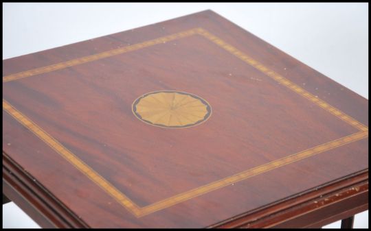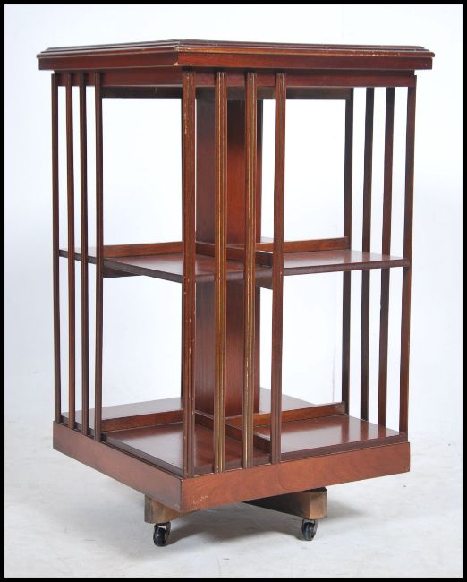 An Edwardian mahogany inlaid revolving bookcase having slatted form with section revolving pedestal body raised on castor base. Measures 80cm high x 45cm wide x 45cm deep.