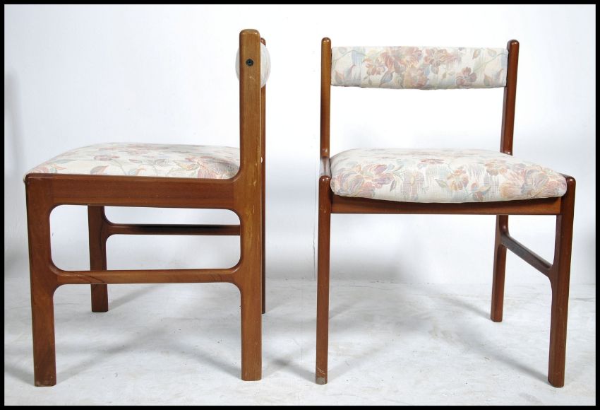 A 1970's set of 4 retro Danish inspired teak wood dining chairs having chamfered edge frames with low return stretchers to the legs having chintz inspired upholstered and back rests. Measures 70cm high x 51cm wide x 47cm deep.