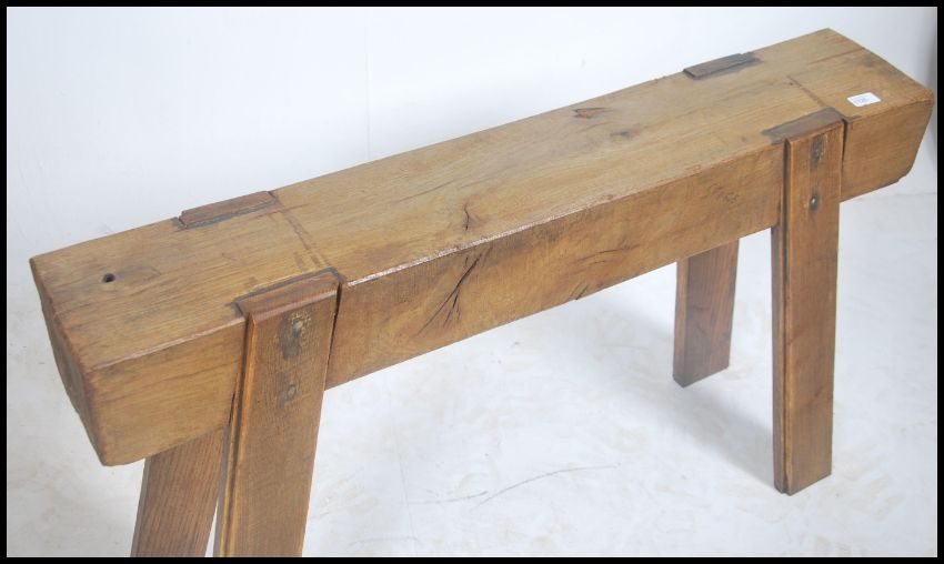 A rustic 19th century vintage solid oak farmhouse pig bench. The top of heavy thick cut plank form being raised on angled supports. Measures 65cm high x 110cm wide x 30cm deep.