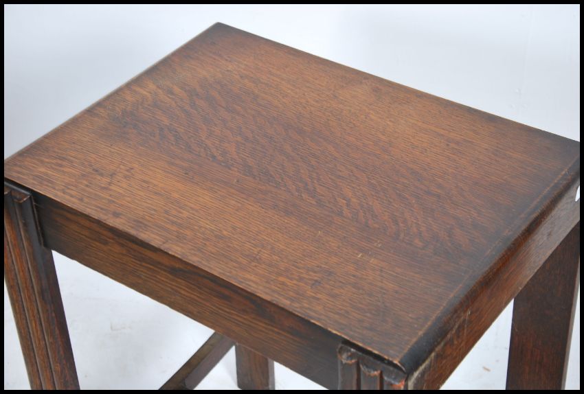 A 1930's Art Deco oak side table having reeded and banded supports with twin tiers together with another oak Art Deco table being slightly darker in colour. Measures 74cm high x 56cm wide x 43cm deep.