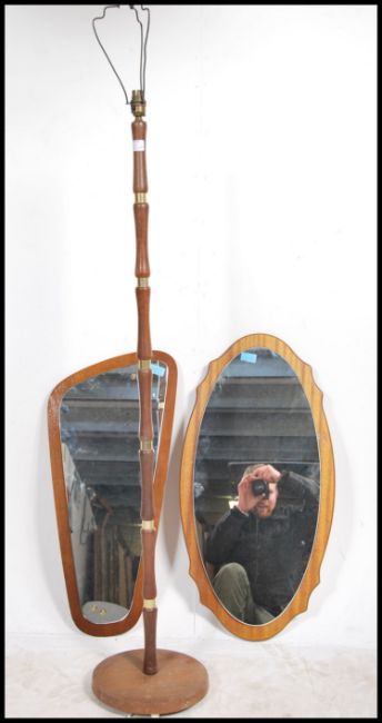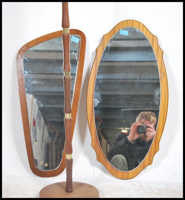A pair of 1970's retro frameless teak wall mirrors of atomic form. Differing shaped with frameless mirrors applied to teak chamfered edge back panels