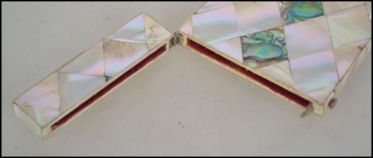 A Victorian mother of pearl and abalone shell card case, set with panels of abalone and mother of pearl shell, together with another card case. Measures 10cm high
