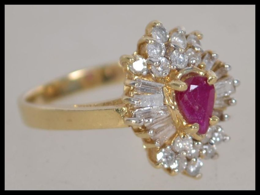 A stunning ladies 14ct yellow gold and ruby with diamond cluster ring. The heart shape ruby being claw mounted surrounded by baguette and round cut diamonds. 4.3g - Size N
