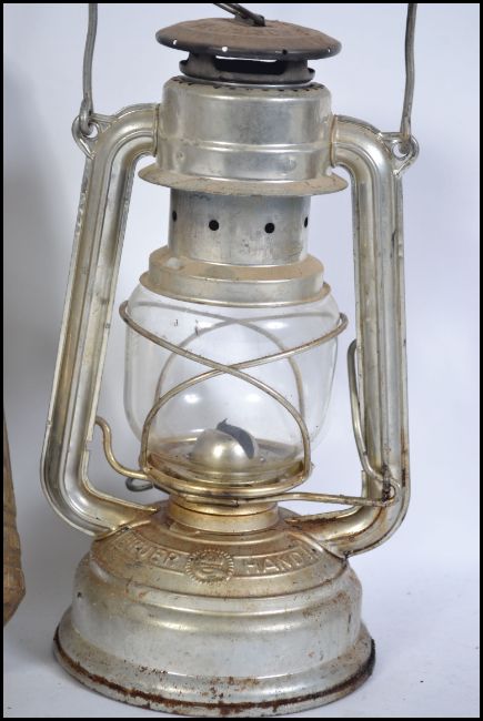 A pair of 20th century German made Tilly style storm lamps together with a vintage brass fire extinguisher. Measures 39cm high.