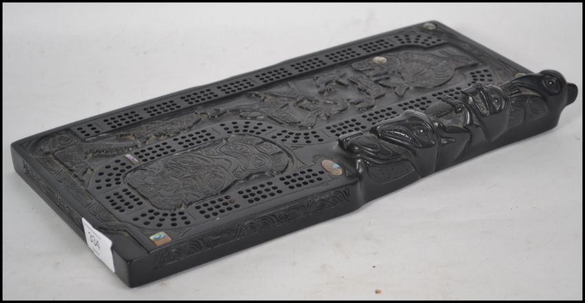 A cribbage board in the Haida native american style with totemic decoration and haliotis shell inlaid panels dating to the 20th century. Measures 34cm wide.