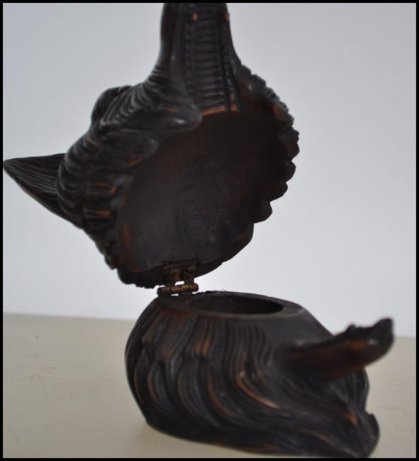 A beautiful carved wooden black forest inkwell in the form of a fox having hinged top with inkwell recess within
