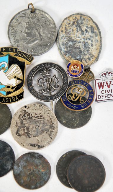 A collection of 19th and 20th century coins both silver and copper together with medals enamel badges etc