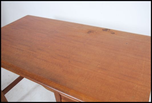 A superb mid century Danish inspired teak desk having an open kneehole recess flanked by a pedestal of drawers with shaped handles. Atop a fabulous rectangular fixed desk top with chamfered edge details. Measures 78cm high x 122cm wide x 69cm deep.