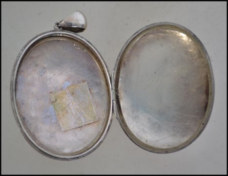 A Victorian large silver locket of oval form being chase decorated with hinged centre and bale atop. Unmarked  (tests as silver ) Weight 18.9g / size 5cms x 4cms wide