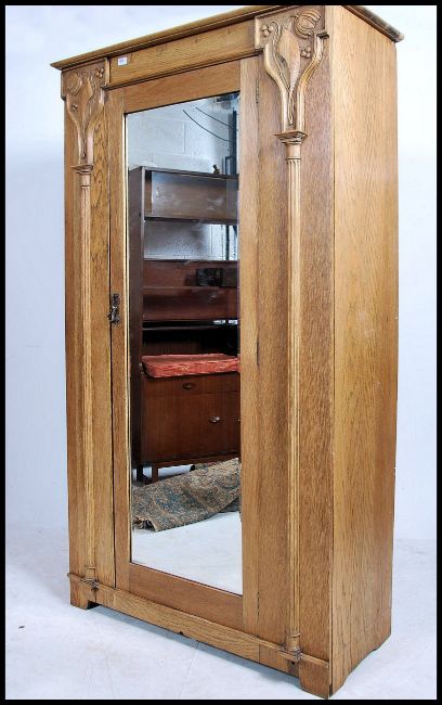 An Edwardian Arts  & Crafts solid oak single wardrobe having central mirror door with beautiful carved panels either side with flared cornice atop. Measures 186cm high x 107cm wide x 47cm deep.