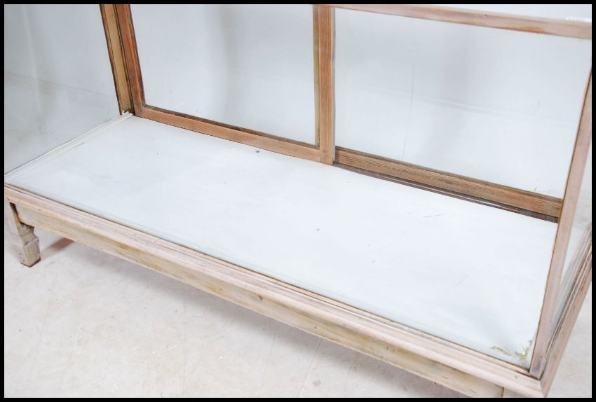 A 1930's stripped oak shop haberdashery display shop counter being raised on sqaured legs with glass panelled body