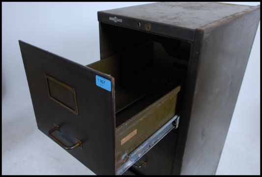 A believed ex British Military / Industrial upright slim four drawer filing office cabinet in the original green paint with pulls and brass notation slides.