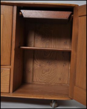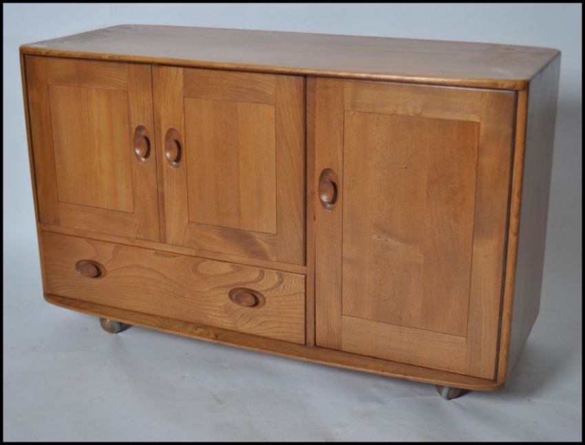 An Ercol 20th century elm wood sideboard of small proportions. The sideboard comprising a series of drawers and cupboards having a solid elm wood chamfered edge top above. Measures 71cms high x  113cm wide x 49cms deep.