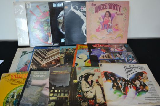 A collection of long play LP's vinyl albums featuring several artists on various labels to include Donovan, David Bowie, Goddess Of Fortune, The Beatles x 31967 - 1970 ( on blue vinyl ) The White Album ( French ) and Sct Peppers, The Kinks, The Monkees, The Byrds, The Uncler Dirty Primer, The Rolling Stones, Strawbs