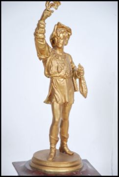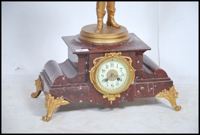 A 19th century large French rouge marble mantel clock. The large rouge marble base raised on gilded enamel supports having a cylinder movement with  enamal dial having Roman and Arabic numeral chapter ring finished with a large gilt surmounted figurine above