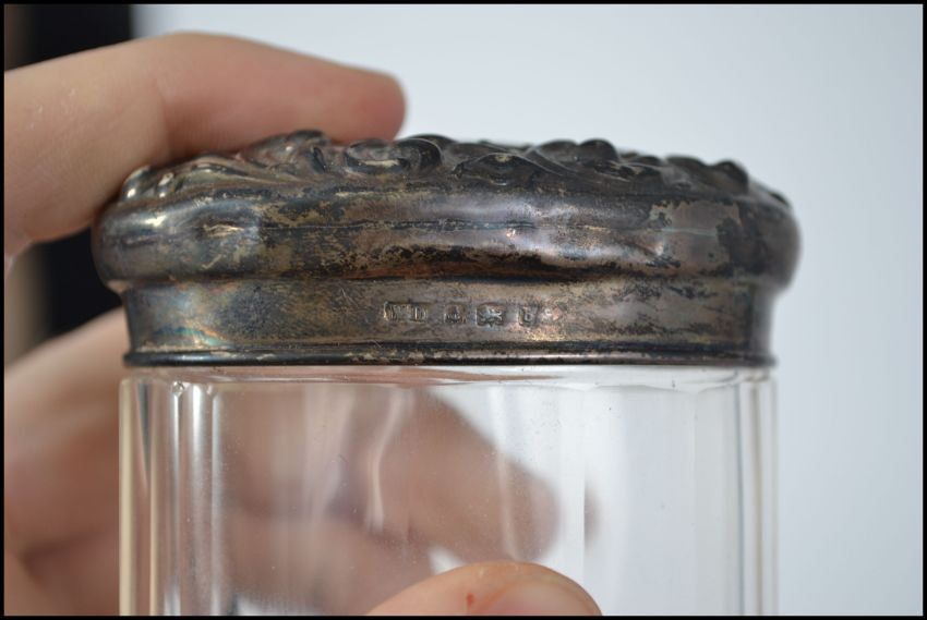 A collection of vintage glass dressing table items with silver hallmarked tops to include a tortoiseshell topped one. To include makers such as William Davenport, Henry Matthews, Levi Salaman.