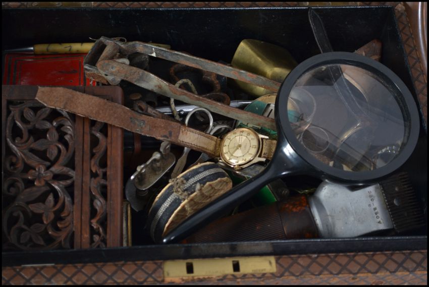 A stunning mxed lot to include Ingersol watches, desk calendar, Bakelite hair clippers, lighters, nut crackers, fret pierced post card box etc please see images.