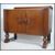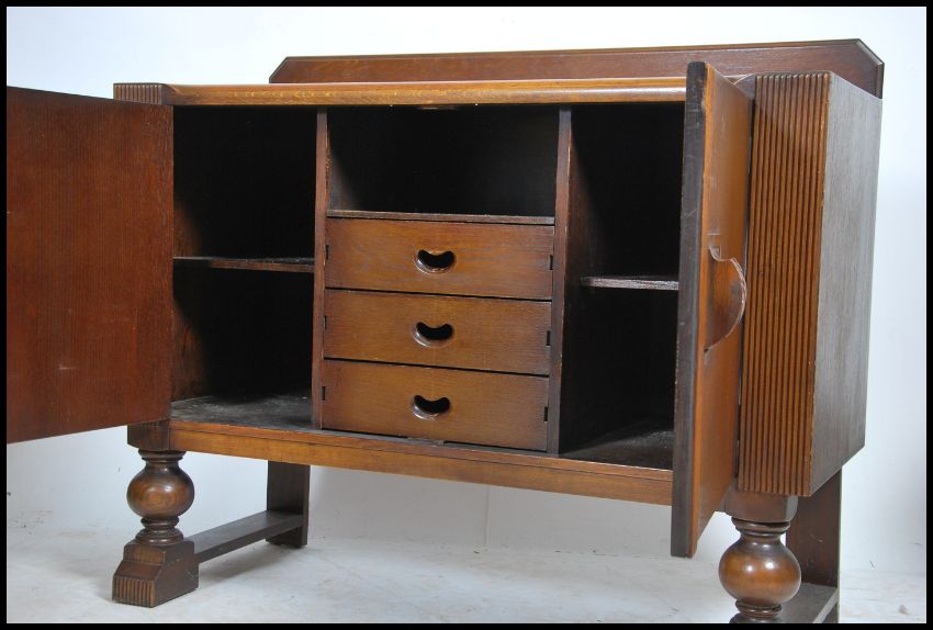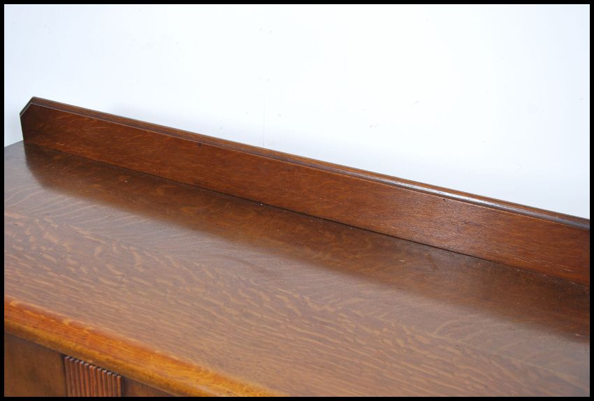 A 1930's Art Deco oak sideboard having shaped supports with a series of drawers and cupboards having embellished decoration. Matching table and chairs in lot 1265